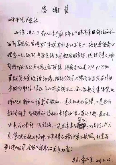 11月18日,東站服務(wù)臺收到了乘客章興佳親手送來的一封感謝信,這是一封寫給東站業(yè)務(wù)站站長鄭宣偉的感謝信,信中寫到失主章興佳于10月21日從景寧乘車到麗水,不慎將手機遺落在車上,在他發(fā)現(xiàn)手機不見后,抱著僥幸的心里來到服務(wù)臺尋求幫助時,業(yè)務(wù)站站長鄭宣偉第一時間幫他聯(lián)系駕駛員尋找手機的事情。